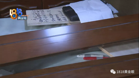 此外之外,電視護墻的反面有紅色石膏的蹤跡,他說此前撬開過一點,發掘有拼接蹤跡。現場又用螺絲刀演示了一下,撬下了部分木頭屑。